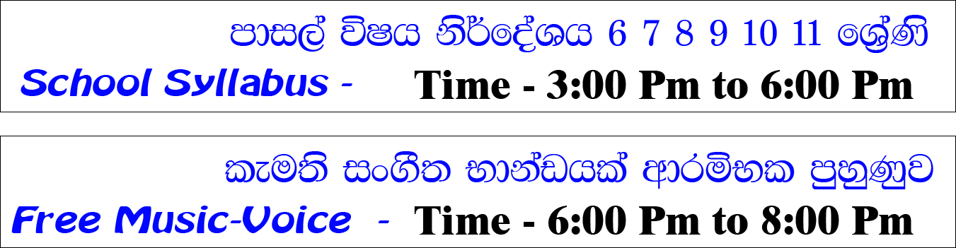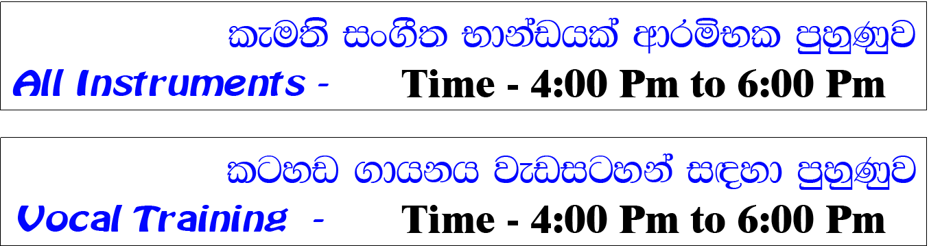 අපගේ සංගීත පංතිය අලුත්ගම cargills food city සිටිය අසල Durdans lab එක පිහිටා ඇති ගොඩනැගිල්ලේ දෙවැනි මහලේ පිහිටා ඇත... දෙක ශ්රේණියේ සිට එකොළහ ශ්රේණිය දක්වා..පාසල් විෂය ධාරාවට අනුබද්ධ සංගීත විෂය.සහ..ඔබ කැමැති සංගීතභාණ්ඩයකින් ඉගෙන ගැනීමට ඇති හැකියාව අපි ඔබට ලබා දෙන්නෙමු. සංගීත භාණ්ඩ රැසකින් යුත් අපගේ සංගීත ආයතනය.Smart music academy & Audio studio recoding පහසුකමින් යුක්තවේ.. සංගීතය පමණක් නොව..ඔබගේ දරුවාගේ ජීවිතය. වෙනස් කර ගැනීමට සහ ආකල්ප වර්ධනය සඳහා .අප ඔවුන්ට දැනුම ලබා දෙන්නෙමු... සංගීත අධ්යක්ෂක .කථිකාචාර්ය. මනෝ වෛද්ය හා සංගීතය ජනමාධ්යවේදී / විශාරද දහම් ශ්රී මධුශංඛ පීරිස්. එතුමාගේ ප්රධානත්වයෙන් සියලු දරුවන්ගේ කුසලතාවන් ඔප්නැන්වීම සඳහා ..අප ආයතනය කැපවී සිටින්නෙමු...
